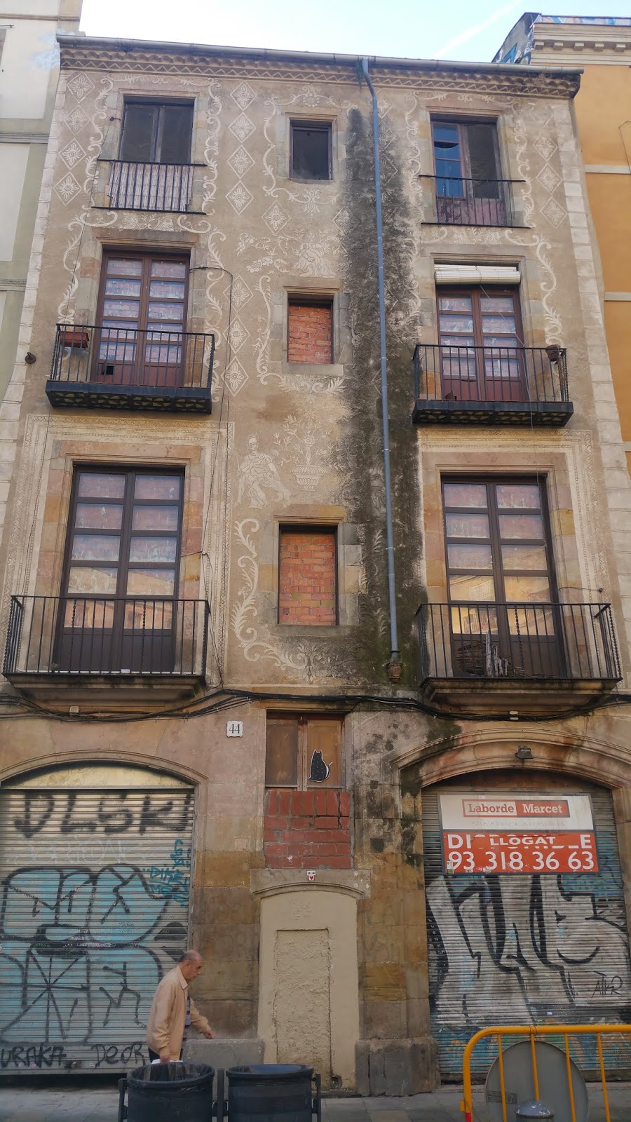 Voilà l’exemple d’un immeuble bien particulier que j’aime beaucoup et qui a déjà été l’objet de nombreuses convoitises. Il a été restauré en 1998/2000 ce qui a permis de mettre en avant les superbes esgraffiats baroques de sa façade. Il se trouve en plein quartier Gotic (vieille-ville), sur la petite place George Orwell qui en a déjà vu des vertes et des pas mures!!