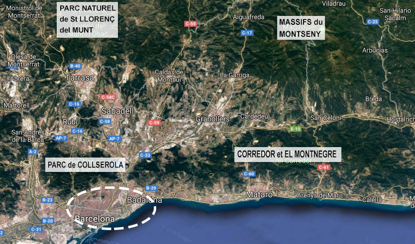 Barcelone est entourée de montagnes. Les contreforts des Pyrénées ont formé des couloirs montagneux qui suivent le littoral…bref, le relief est assez accidenté! La sierra litoral, el corredor et el Montnegre, le Montseny, tout autant de parcs et de réserves naturelles, tout autant de magnifiques paysages protégés!!!